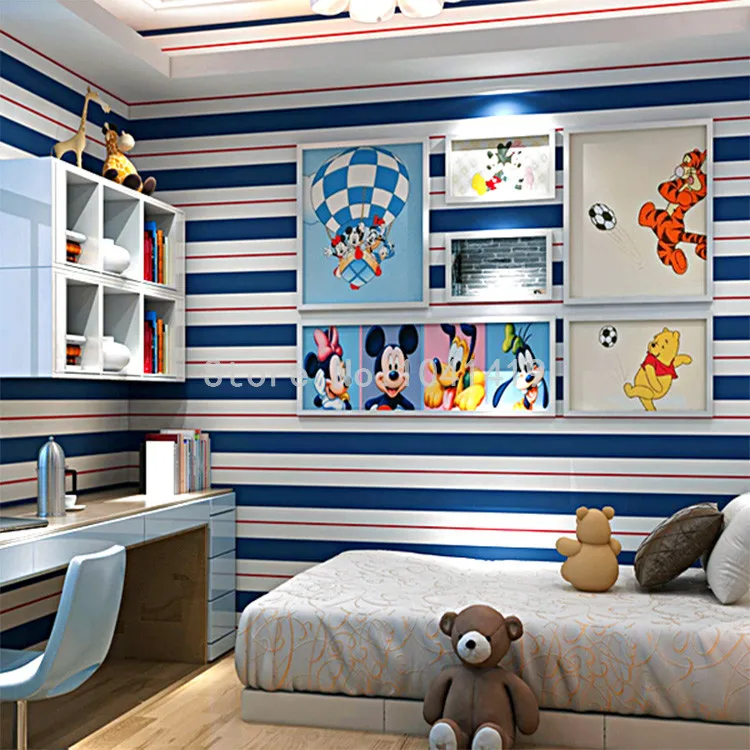 Обои в полоску для детской комнаты, как правило, подбирают, учитывая увлечения ребенка. Чаще всего это комбинированная полоса в сочетании с фотообоями или рисунками сказочных персонажей. Для более взрослых детей цветовое решение используют в теплых тонах летней палитры оттенков. К ним относятся желтые, голубые, бирюзовые, насыщенные синие, белые, салатовые, розовые, оранжевые цвета.