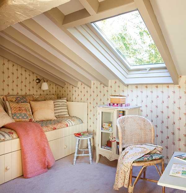 Стены и полы мансарды, отделанные деревом, это практически классический вариант. Деревянные поверхности так же можно окрашивать в светлые цвета – белый, кремовый, бежевый, цвет слоновой кости, либо же декорировать стены обоями так же легкой светлой гаммы. Для соблюдения ансамбля декоративных элементов следует дублировать узоры, принты или цвета обоев в текстиле или предметах мебели – к примеру, растительные завитки, изображенные на обоях могут перекликаться с резными деталями мебели, рисунками на покрывалах, подушках, панно и так далее.