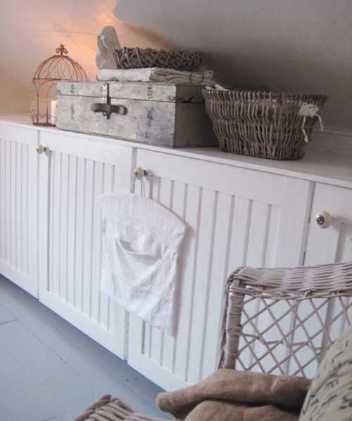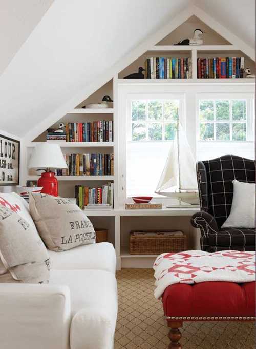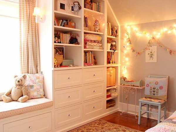 Шкафы для вещей, игрушек и книг располагают вдоль скатов. Лучше, если это будет эргономичная встроенная мебель, с множеством полок и выдвижных ящиков. Для игрушек можно придумать красивые ящики или сундуки, а сверху на крышку положить мягкий матрасик с цветными подушками. Таким образом, получится не только место для хранения, но и красивый диванчик.