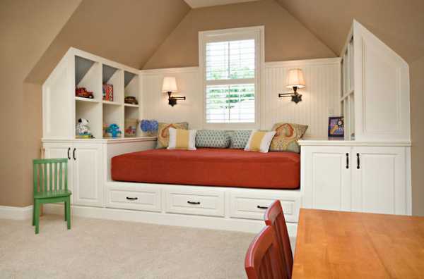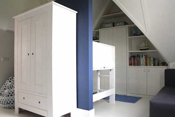 Детская в мансарде должна быть оборудована такими предметами мебели, как шкафы. В небольшом помещении лучше сделать их встроенными. Это также поможет сэкономить место.