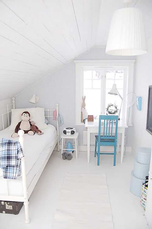 Детская на мансардном этаже, фото помещения с односкатной крышей