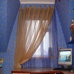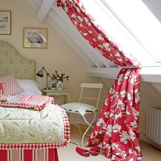 Мягкости стилю придадут воздушная органза или тюль с рюшами. Для окон со скошенными рамами необходимо предусмотреть перепад длин гардин. Ткани с купонными орнаментами в этом случае не подходят.