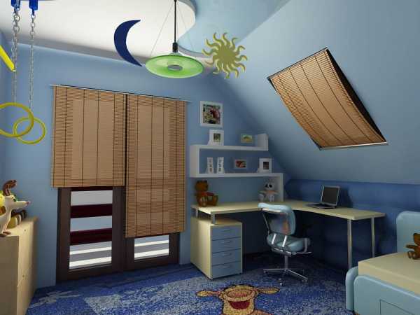 Интерьер детской на мансарде следует выбирать в зависимости от того для мальчика или девочки вы планируете обустроить комнату. В первую очередь следует обращать внимание на цвет. Для маленьких мужчин можно выбирать синий, серый, голубой и остальные цвета из яркой или темной гаммы.