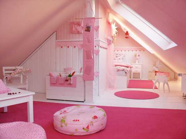 Для девочки, например, можно обустроить на мансарде уютный уголок в стиле комнаты Барби. Малышка наверняка обрадуется обилию розовых цветов. Мебель в такой детской должна быть не только красивой, но и функциональной. При помощи разных цветов или оттенков одного из них следует осуществить зонирование пространства, визуально разграничив место для сна и отдыха, рабочий уголок и игровую зону.