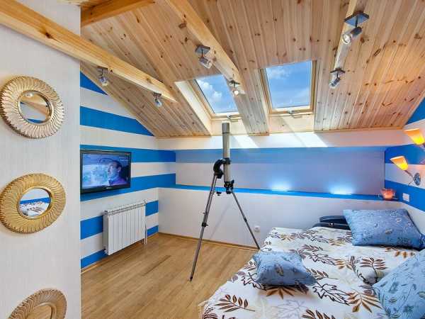 - морское путешествие. Светлые цвета моря и теплого песка в сочетании с грубоватостью мебели будут играть на контрасте. А если балки перекрытий не спрятаны под отделку, можно использовать и сети, и цепи, и другую атрибутику моря.