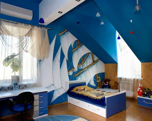 Помещение подобного типа можно оформить в популярном морском стиле. Подойдет он не только для мальчика, но и для юных представительниц прекрасного пола, обожающих приключения. Оформить помещение лучше в бело-синей или бело-голубой гамме. На стены можно поместить рисунки с изображением парусников или дельфинов.