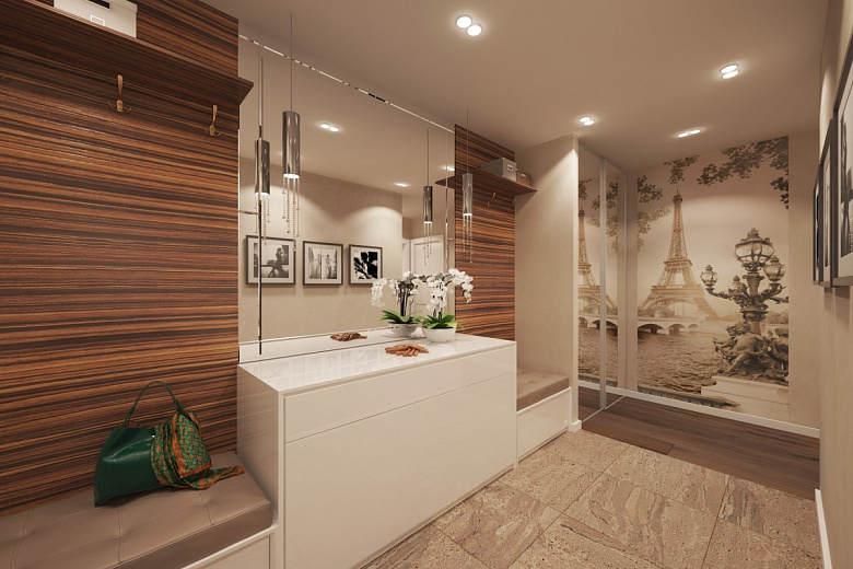Дизайн прихожей должен создавать ощущения приветливости, и соответствовать стилю остальных комнат. Для визуального увеличения пространства прихожей, стоит выбрать обои светлых оттенков. Обязательные элементы любой прихожей это – полка для обуви, вешалка для одежды, и, конечно же, большое зеркало. Если размеры прихожей позволяют, то можно расположить еще и вместительный шкаф, и тумбу для полезных мелочей. А на стенах стоит разместить небольшие картины.