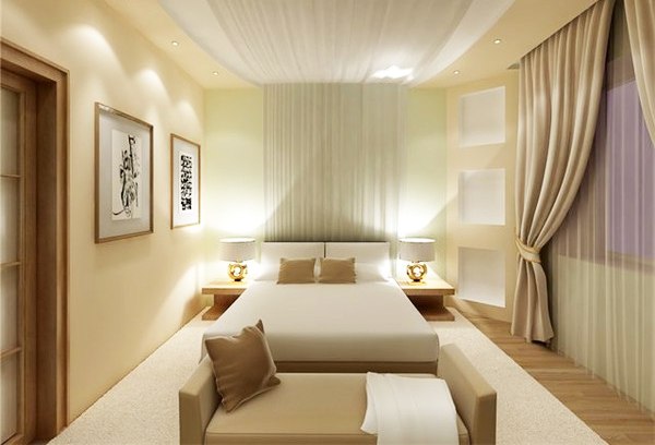 Ограниченные квадратные метры не позволят применить в узкой спальне гипсокартонные изделия, которые популярны сегодня. Предпочтение лучше отдать гладким, ровным поверхностям без заметных дизайнерских деталей.