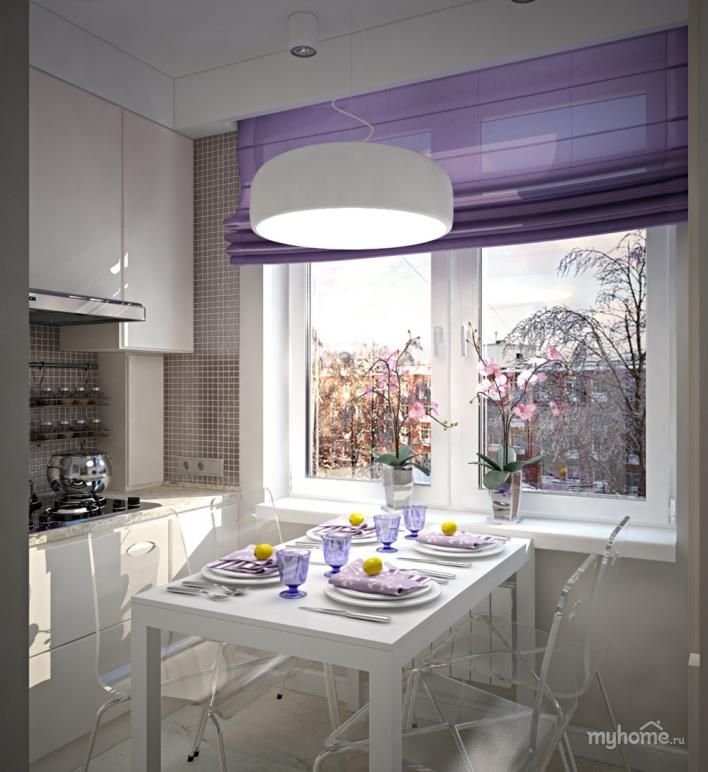 На кухне площадью 7 кв.м. не обязательно вешать шторы, но если необходимость спрятаться от солнца и посторонних глаз велика, рекомендуется остановиться на легких занавесках, жалюзи или шторах-кафе. Если их текстиль будет «созвучен» со скатертью, это придаст целостность дизайну.