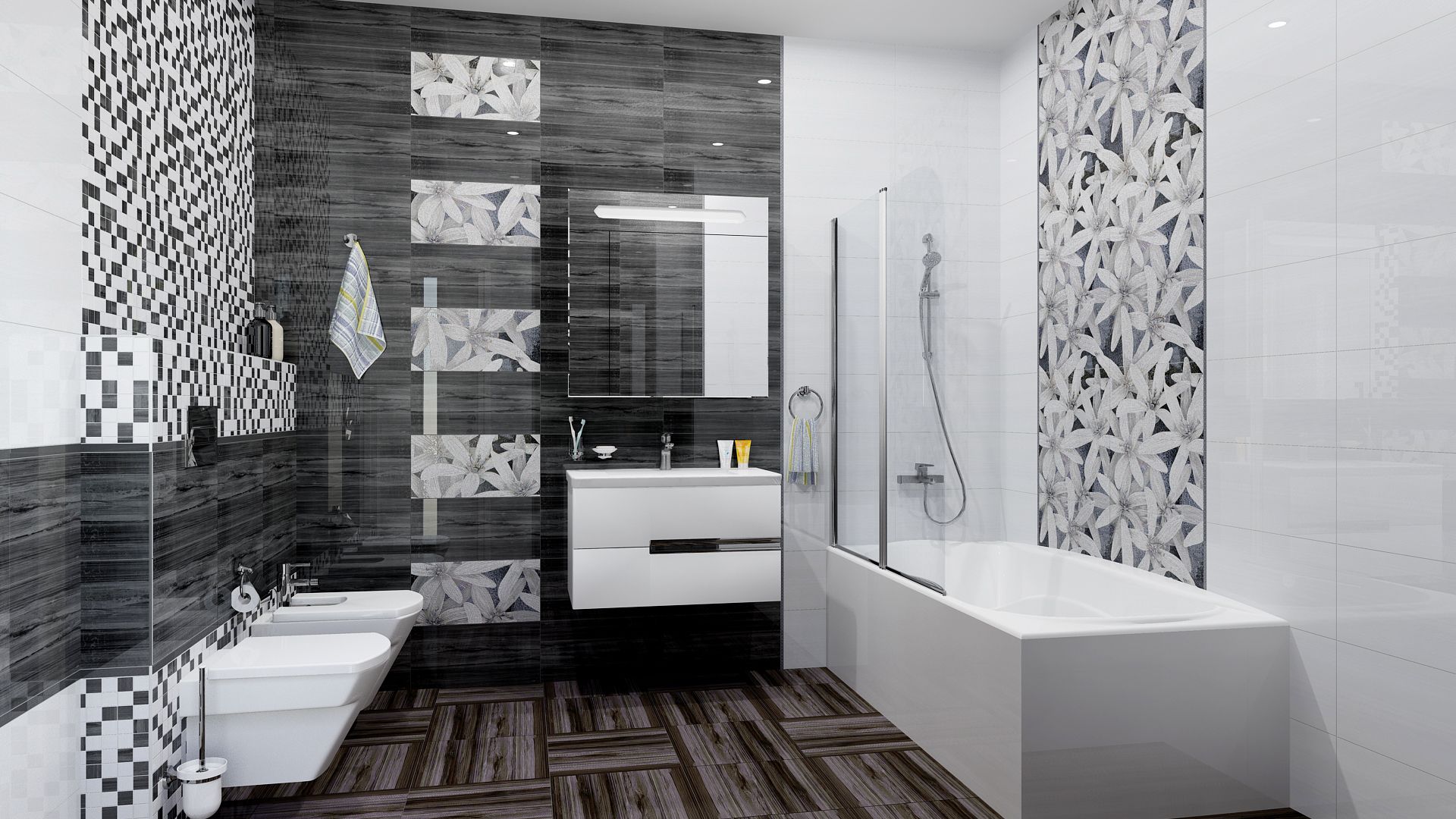 Под этим подразумевается черный пол, белый верх стен, выложенная черной плиткой та часть стены, где висят светлые зеркала или яркие лампы, а белой – та честь, у которой стоят шкафчики, вешалки для полотенец.