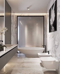 К отделочным материалам для ванной в современном стиле выдвигаются только практические требования, а визуальный образ может варьироваться в зависимости от дизайн-проекта.