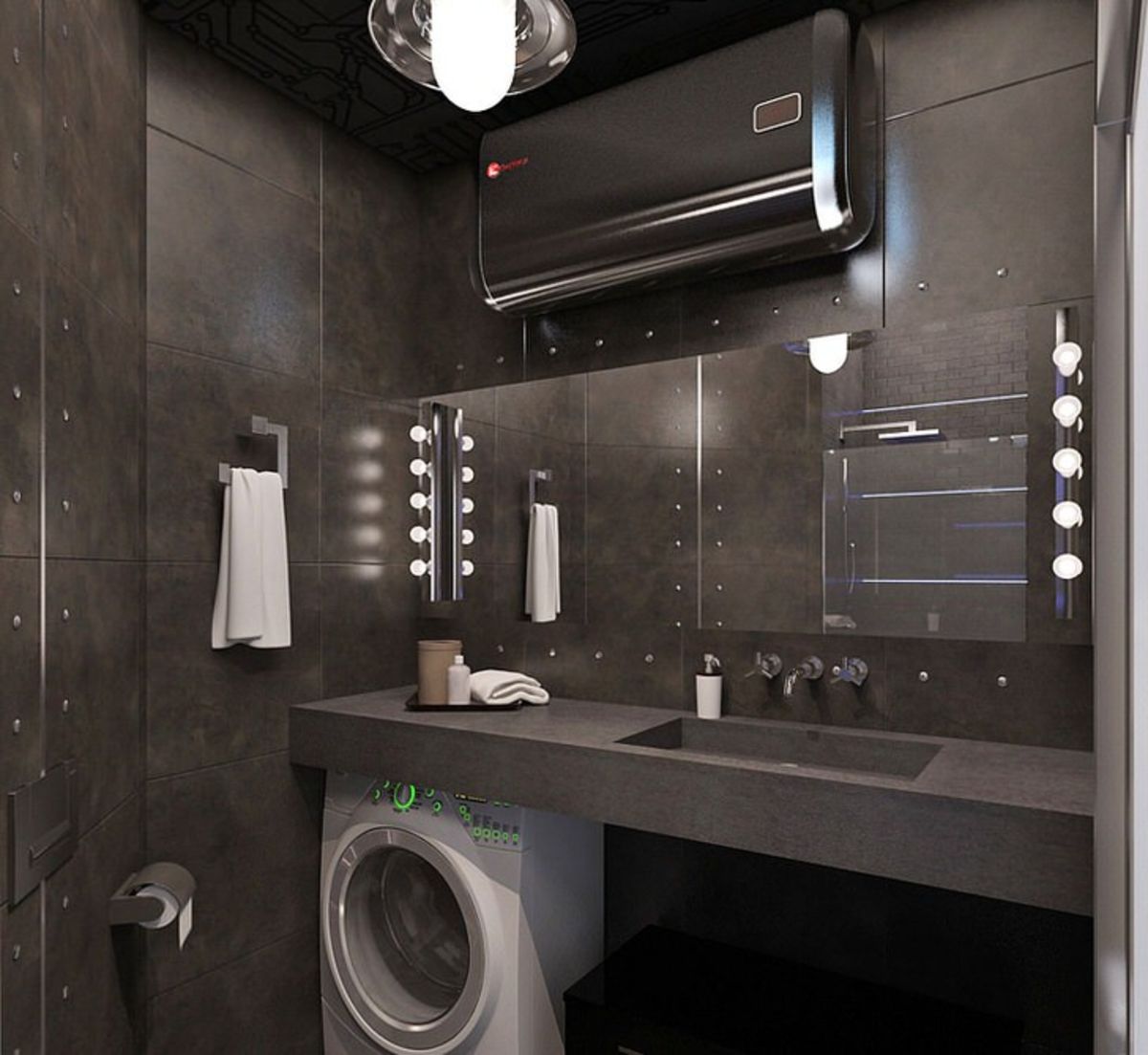 - Стиральную машину лучше всего link под раковиной. Ради этого можно смириться даже с ее ограниченной производительностью. Установив над ней небольшую столешницу, может использовать ее в качестве туалетного столика.