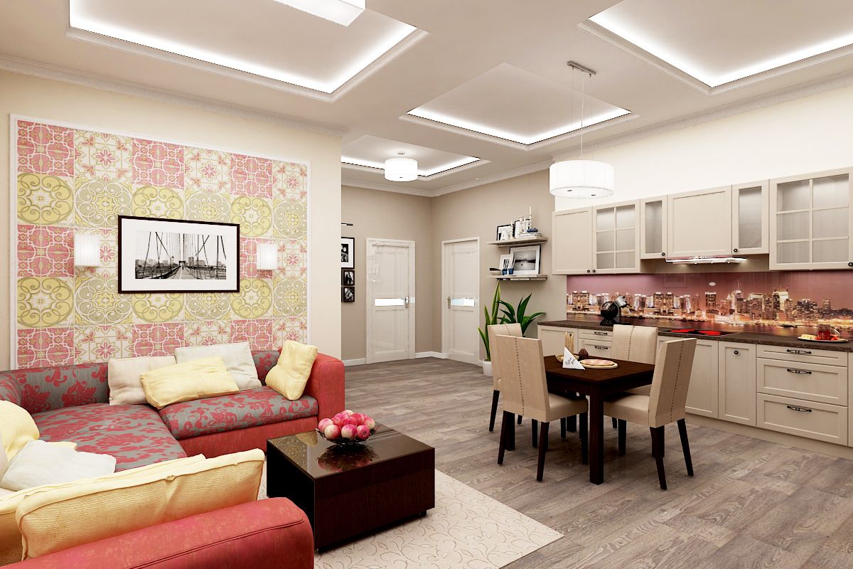 Самое главное не городить многоуровневые потолки. Если вы владельцы небольшой квартиры, отдайте предпочтение одноуровневому потолку, зонировав пространство светильниками. Второй прием – светлые цвета в отделке стен и мебели. Не стоит клеить по всему помещению темные обои или выбирать мебель цвета венге. Это визуально уменьшит ваше пространство.
