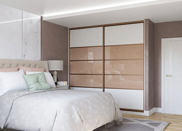 Шкаф-купе в спальне с телевизором размещают вдоль стены, напротив окна. Это позволит приобрести купе большой ширины или спроектировать, задав параметры.