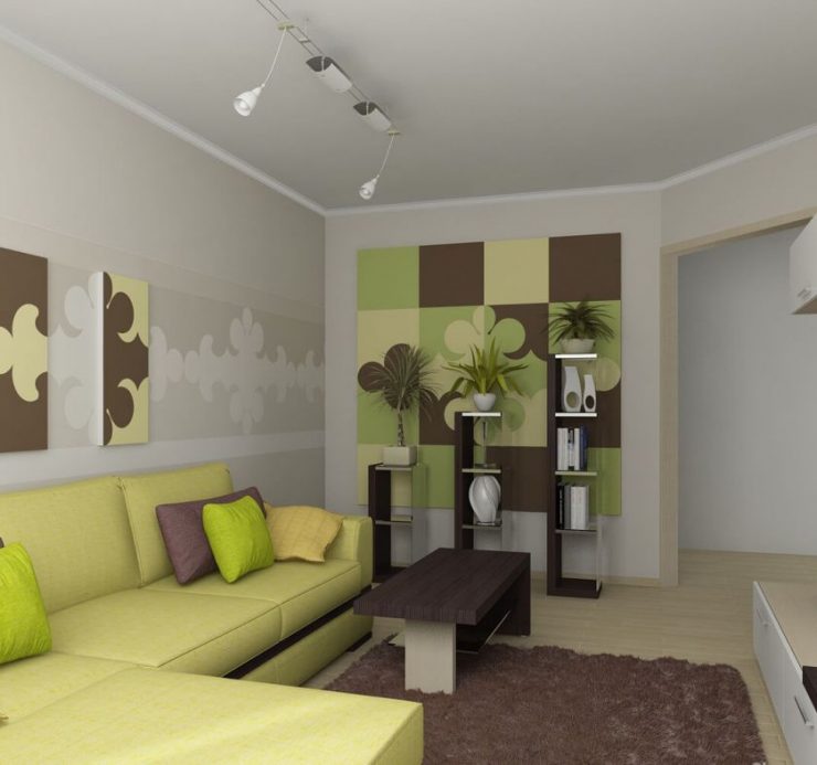 - При небольших габаритах идеальны: изумрудные, оливковые или мятные тона. Для гостиных в зеленом цвете в «хрущевках» такие оттенки просто находка. Они внесут оживление, легкость и аристократический шарм в интерьер.