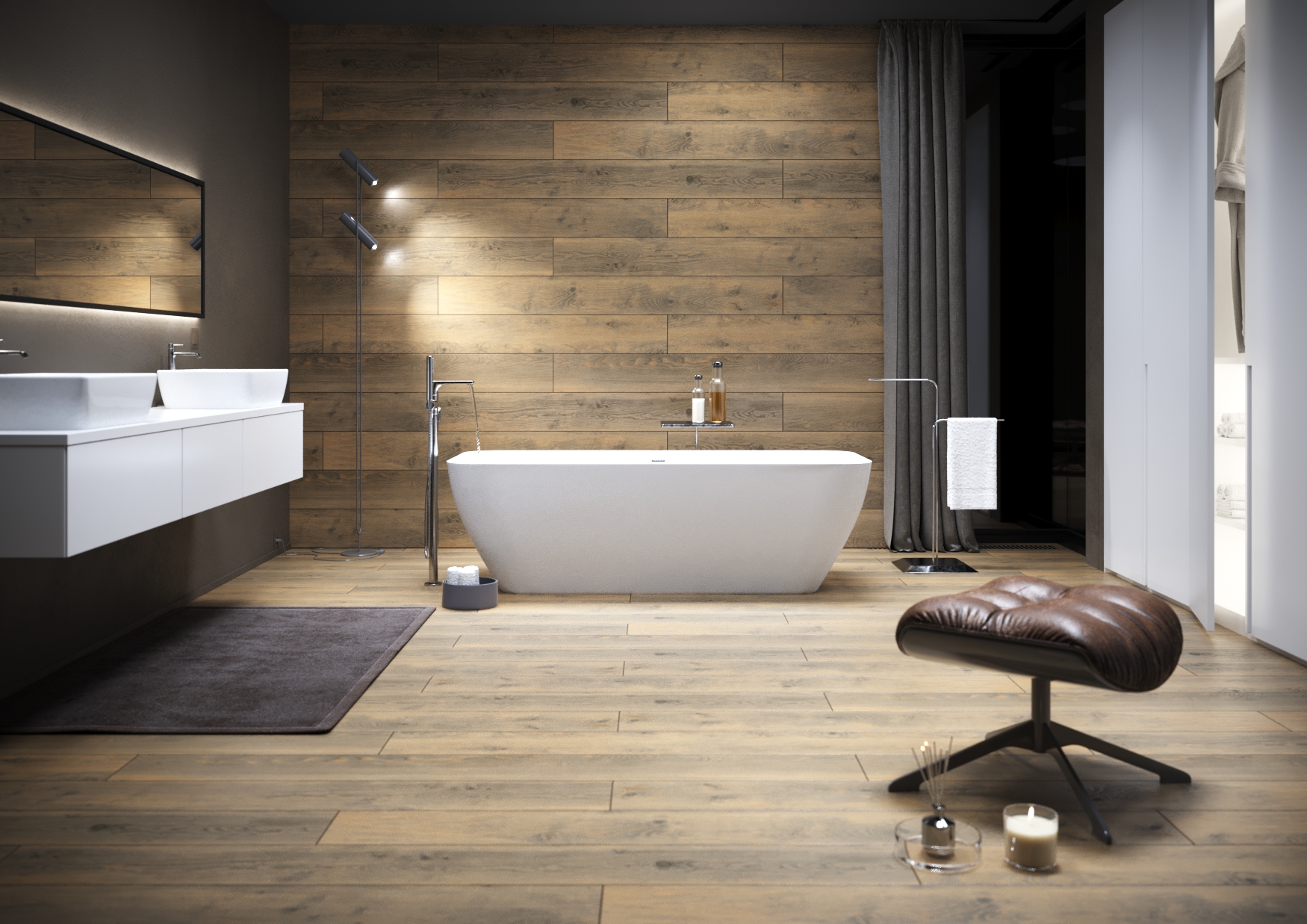 Дерево, пожалуй, один из самых популярных материалов, широко используемый не только в строительстве домов, но и в дизайне интерьеров. В помещениях с высоким уровнем влаги такой материал требует дополнительного ухода, что еще больше увеличивает его себестоимость, именно поэтому плитка под дерево в дизайне ванной комнаты является более предпочтительной и ни сколько не уступает натуральному дереву.