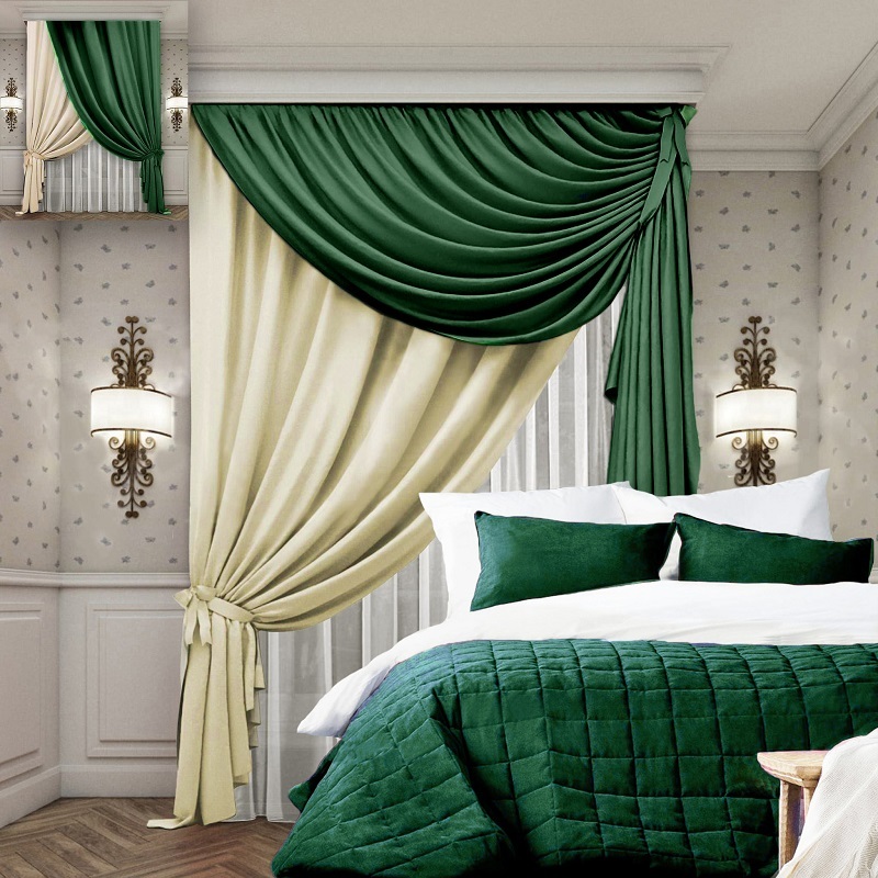 Венские занавеси чаще всего изготавливают из лёгких воздушных тканей. Однако для спальни лучше использовать мягкий бархат или атлас. Эти ткани хорошо драпируются и образуют красивые фактурные складки.