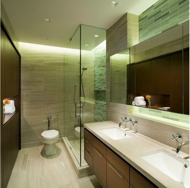 Есть очень интересный дизайнерский ход — сделать встроенные полочки и подсветить их. Так как на стенах чаще всего кафель, эффект получается неожиданно интересным. Неплохо смотрится подсветка снизу ванной или раковины.Их частично закрывают экран, а за ним устанавливают подсветку, можно и цветную (из светодиодов или светодиодных лент).