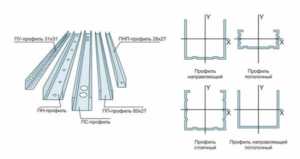 Виды металлических профилей для гипсокартона: а) стоечный; б) направляющий; в) потолочный; г) угловой; д) J-профиль; е) J-профиль скрытый; ж) профиль для рустов; з) профиль для кабеля; и) угловой профиль для арок; к) F-профиль; л) финишный трим.