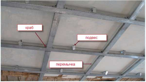 - Монтаж несущих систем CD. К потолку их крепят подвесами. Места крестообразного пересечения профилей укрепляют при помощи «крабов». При этом достигается необходимая жесткость конструкции.