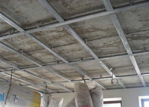 Первый вид идеален во время ремонтных работ в небольших помещениях, квартирах, например. Суть его сводится к тому, что главный профиль посредством каркаса крепится к потолку, а профили, на которые будут крепиться листы гипсокартона, размещают на разные уровни. Расстояние между профилями должно составлять 100 см, а между подвесами оно должно быть 90 см. Расстояние между одним и другим профилем должно быть не меньше 50 см, так же оставьте интервал в 10 см от стен до самого профиля.