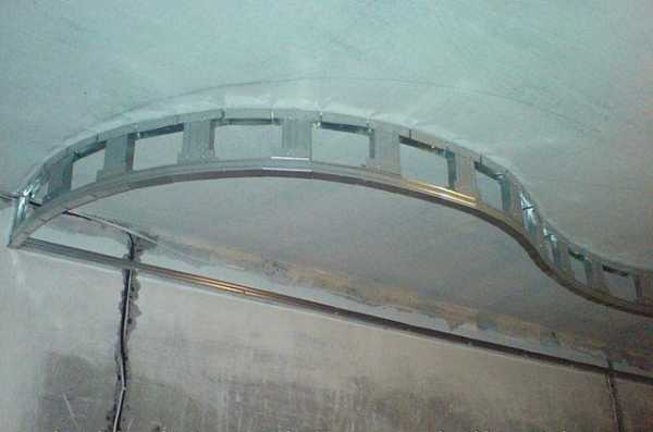 - Начальный этап монтажа гипсокартонной конструкции подразумевает крепеж прочного каркаса из армированных реек к потолку и по периметру стен.