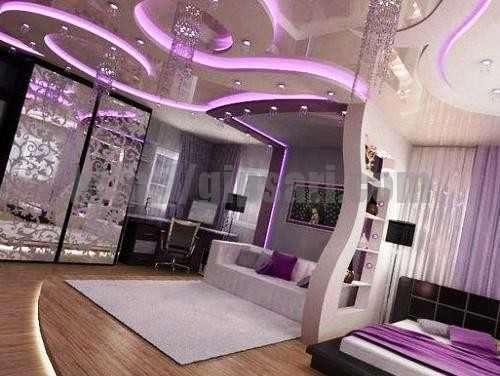 В соответствии с дизайном комнаты, потолок из гипсокартона можно декорировать всевозможными красками, это позволит добиться яркого, оригинального оформления. Так же имеет место отделка гипсового потолка различными видами декоративной штукатурки.