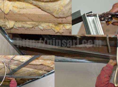 - Из потолочного профиля нарезаем продольные и несущие детали каркаса, используя при этом ножницы по металлу. Для этих целей лучше всего выбрать жесткий профиль;