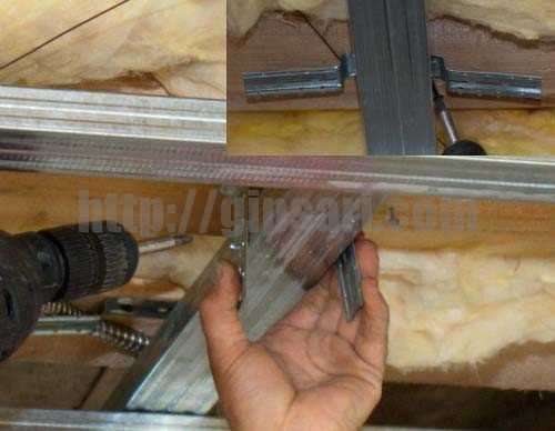 Шаг третий. Из потолочного профиля с жесткими ребрами ножницами по металлу нарезают несущие и продольные элементы каркаса. Когда длина помещения превышает 4 метра (стандартный размер для профилей), используют специальные удлинители. Расстояние между двумя профилями каркаса должно быть 120 сантиметров по длине и 60 сантиметров по ширине (согласно параметрам листа). Друг с другом элементы каркаса соединяются «крабами», а к профилям их крепят шурупами-саморезами. В местах установки соединений необходимо обращать внимание на степень нагрузки на конструкцию, так как при необходимости ее можно усилить дополнительными подвесами и таким образом вес будет распределяться равномернее. После того, как прочная фиксация каркаса обеспечена, начинается монтаж гипсокартона.