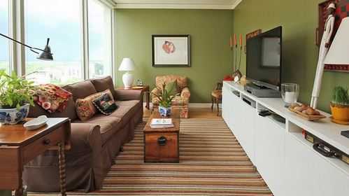 Зеленый, цвет простора, выбран удачно. Полосатый ковер на полу служит зрительному расширению. Мебель расставлена правильно. Продуманы и дизайн, и декор.