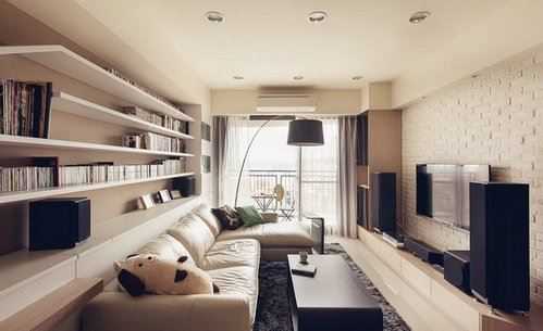 Область за диваном перегружена, но комната все равно выглядит довольно широкой. Этому способствуют и цветовая гамма, и полочки за диваном, дающие иллюзию объема.