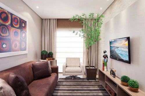 Маленькая узкая комната совсем не похожа на пенал. Гостиная получилась гармоничной и уютной благодаря цвету, асимметрии, правильной расстановке элементов по всем направлениям (вдоль длинных стен, поперек комнаты, по центральной оси).