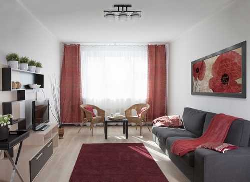 Красные шторы зрительно приближают короткую стену, делая комнату ближе к квадратной. Часть мебели установлена перпендикулярно длинным стенам. Светлый пол создает ощущение простора. Здесь все сделано правильно. Но картину стоило бы предпочесть нейтральную.