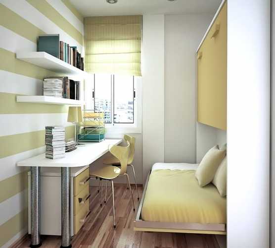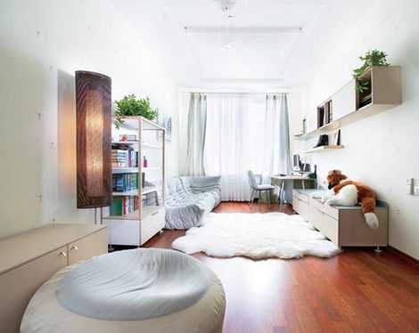 Мебель для узкой комнаты должна быть удобной, компактной и функциональной. Узкую комнату можно разделить на квадратные зоны с помощью стеллажей. Предназначение для зоны определите сами. Перегородка не должна быть полностью глухой, в противном случае, зоны будут темными и мрачными.
