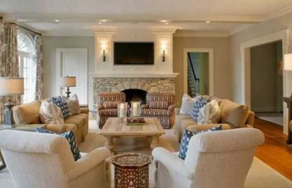 Круговая расстановка мебели тоже подойдет для прямоугольных комнат. Выберите условный центр (стол, телевизор, камин) и расположите предметы мебели по отношению к этому центру.