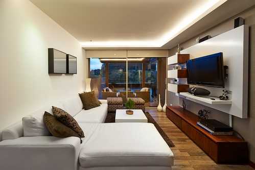 К дизайну гостиной прямоугольной формы (фото разных вариантов ниже) следует подходить особенно внимательно, если комната небольшая. В этом случае лучше выбирать мебель-трансформер, легкие пуфы вместо массивных кресел, стеклянные столики вместо громоздких деревянных.