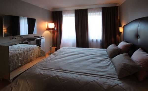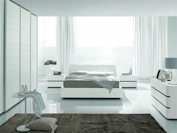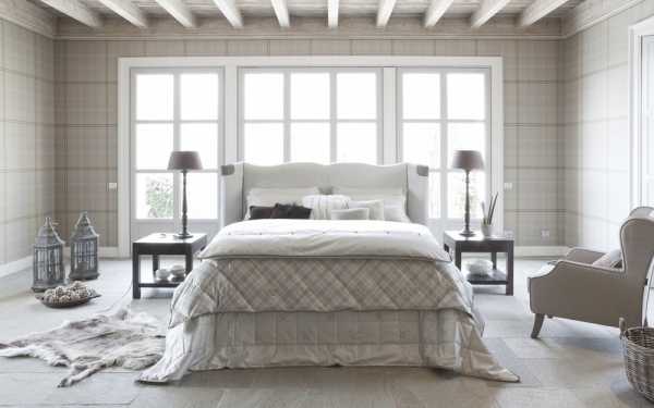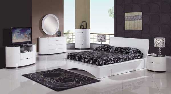 Кровать ставят посередине стены, изголовьем к стене, а с двух сторон от кровать ставят две тумбочки с плафонами. Напротив устанавливают комод с зеркалом или телевизором, а у одной из стен шкаф.
