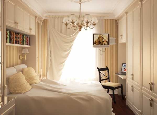 Если окно находится на смежной, большей по протяженности стене, рекомендуется иной вариант расстановки мебели ― по узкой стороне встраивается шкаф-купе с дверцами того же тона, что и стены. Комната становится короче на глубину шкафа, что делает ее ближе к квадрату.