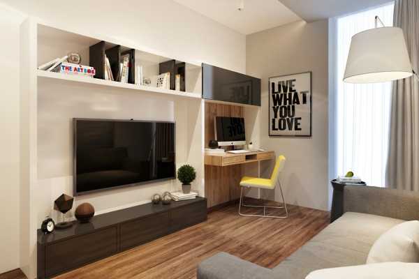 По бокам от телевизора ставят одинаковые полки или стеллажи (можно обойтись стенкой, где все уже предусмотрено) . Письменный стол можно поставить в один из углов, а книжный шкаф установить рядом со столом (но он не должен быть слишком громоздким). Помните — и в большой, и в маленькой гостиной не переборщите с обилием мебели.