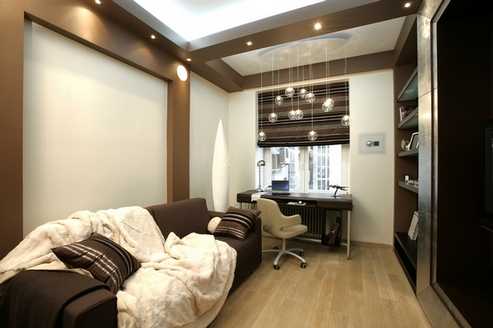 Все, что нужно для организации рабочего пространства (компьютерный стол, стеллаж для книг, полочки) оптимально расположить у оконного проема, в частности, если помещение вытянуто перпендикулярно ему.