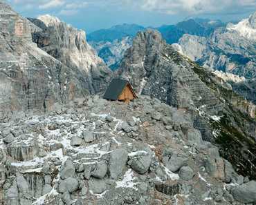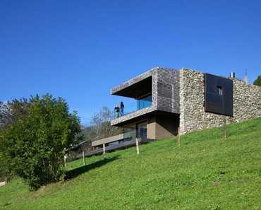 Этот дом стоит на вершине скалы, поэтому первый этаж, в котором разместился гараж, находится в подвальном помещении. Сверху надстроено еще два этажа, где нашлось место для жилых помещений и открытых зон отдыха.