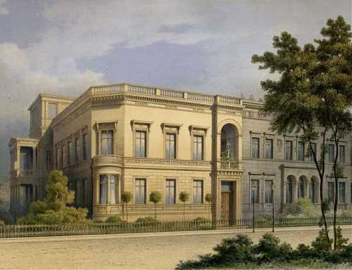 Двухэтажное здание, рисунок конца 19 века. Архитектурная идея основывается на стиле классицизм.