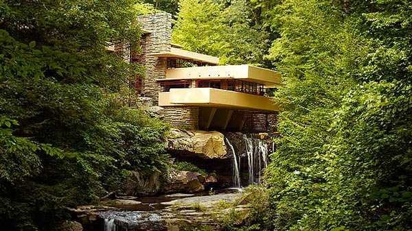 Фрэнк Ллойд Райт в своих всемирно известных работах развил идею Луиса Салливана о том, что красивый и гармоничный дом современной архитектуры «вырастает из ландшафта», являясь его органической частью, а не «плюхается» сверху, чтобы выглядеть как чужеродный объект. На фотографии: Дом Фоллингуотер (резиденция Кауфмана), построенный по проекту архитектора Фрэнка Ллойда Райта в 1935 году в сельской местности юго-запада Пенсильвании в 69 км к юго-востоку от Питтсбурга , штат Пенсильвания. Дом был построен частично над Медвежьим водопадом, что определило название резиденции. Дом стал национальным историческим памятников в 1966 году и в 1991 году был назван членами Американского института архитекутры лучшим американским архитектурным произведением.