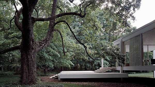 Помещения дома в современном стиле выходят на открытые террасы, деки или дворики, которые являются транзитной зоной между пространством дома и окружающим ландшафтом. Большие площади остекления служат для размытия границ между природой и домом. Современная архитектура дома немыслима без единства интерьера, экстерьера и окружающего ландшафта. На фотографии: Дом Фарнсворт, спроектированный и построенный архитектором Людвигом Мис ван дер Роэ в период между 1945 и 1951 в г. Плано, штат Иллинойс.