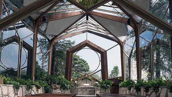 Кровля в доме в современном стиле является важным архитектурным элементом, который и сам по себе мог бы являться отдельным произведением искусства. Линии и контуры кровля чаще всего создают особые пространства и объемы, развивая идею углов и линий. Ритм открытых балок кровли современного дома, фактура материалов подчеркивается цветом днем и дополнительным освещением в темное время. Такой акцент на внешних элементах кровель является одной из характерных черт современного архитектурного дизайна дома. Даже больше чем просто дома – скорее современного художественного и скульптурного произведения в обличии жилища. На фотографии: Стеклянная церковь или «Часовня путников» в городе Ранчо Палос Вердес, Калифорния. Является частью Сведенборгианской Церкви в Северной Америке и служит мемориалом её основателю, великому хриистианскому мистику Эмануэлю Сведенборгу. Проект церкви был разработан сыном Фрэнка Ллойда Райта — Ллойдом Райтом в конце 1940-х годов. Церковь была возведена в скалах над Тихим оканом между 1949 и 1951 годами.