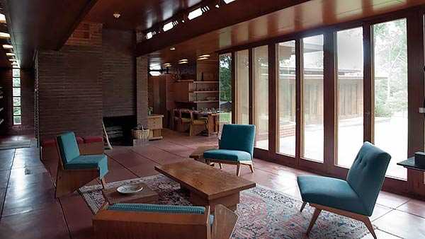 Особенностью домов современной архитектуры являются открытые внутренние планы этажей с меньшим количеством стен. Неразделенное открытое внутреннее пространство дома чаще всего является моделью внутреннего психологического пространства человека. Никому не уютно жить в изобилии тесных изолированных комнатушек связанных узкими коридорами, будь они устроены в доме или в сознании. Открытое интерьерное пространство – это символ того, что домовладелец обладает сильной и цельной психикой, не отделяя и не отвергая отдельные ее составляющие. На фотографии:Интерьер дома для молодоженов Стенли и Милдред Розенбаум, который был возведен в 1939 году по проекту Франка Ллойда Райта во Флоренции, штат Алабама.