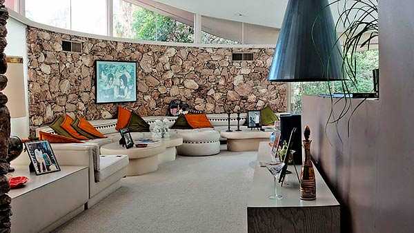 Повседневная жизнь со всеми ее достоинствами и недостатками, приготовление пищи и ее вкушение в семейном кругу – все это естественные составляющие жизни человека. Большинство домов современной архитектуры имею объединенные жизненные пространства гостиной, столовой, семейной или жилой комнаты и кухни. Чаще всего жилая зона акцентирована камином или очагом другого рода, а гостиная имеет большую площадь остекления, открывая взглядам окружающий ландшафт. Если разделения внутреннего пространства и встречаются, то в виде игры цвета, фактуры, уровня пола или потолка, создающих визуальное зонирование помещения. На фотографии:Интерьер дома в Палм-Спрингс, Калифорния, 1962 года постройки, в котором провели медовый месяц в 1967 году Элвис и Присцилла Пресли.