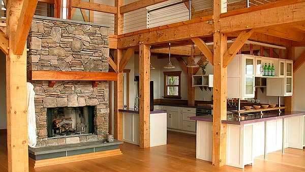 Вместо внутренних опорных стен, ограничивающих и разделяющих свободные пространства, в домах современного архитектурного стиля опорная конструкция выполнена в виде структуры из столбов (стоек) и балок, образующих прочный несущий каркас здания. Привычные стены используются только по периметру здания или для выделения приватных зон. Хотя и внешние стены могут быть выполнены в стиле «пони» — едва приподнимающиеся от уровня пола, открывая пространство свету и взгляду. На фотографии: Интерьер соременного американского дома, построенного по технологии «столбы и балки». Фотография Vermont Timber Works Inc.