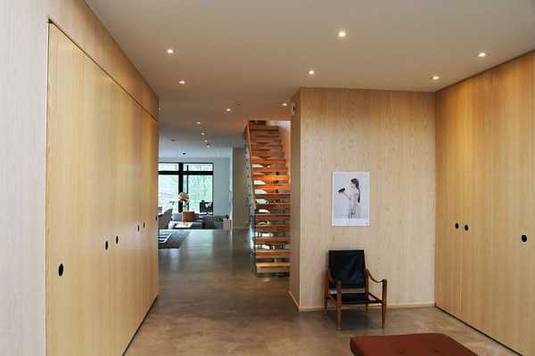 На первом этаже оборудована гостиная, кухня, столовая, библиотека. Внимание привлекает обилие шкафов, действительно – здесь достаточно мест для хранения многочисленных вещей и поддержания порядка в доме. Встроенные шкафы не имеют объемной фурнитуры, поэтому сливаются со стенами и не загромождают собой пространство.
