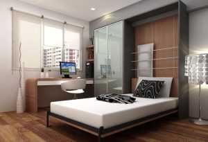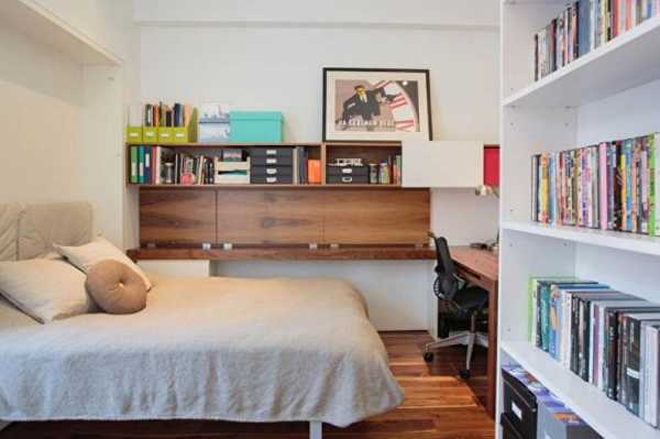 - Спальня-кабинет. Кровать обычно занимает основную часть комнатного пространства, а вариантов расположения рабочего места – несколько: перед окном, в углу с достаточным искусственным освещением, в эркерном выступе, на присоединенной лоджии. Если выбрана модель кровати, которая складывается в шкаф, на дневное время рабочая зона может занимать больше площади.